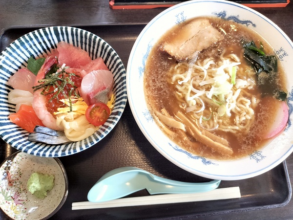 春の陽気に誘われて、久々に直江津方面に釣りにやってきた。ところが、生憎の空模様で雨がポツリポツリ、さらに追い打ちをかけて台風並みの強風。とても釣りどころではない。まぁ、ボーッと海を眺められただけで、いい休息になったかな。帰り際、上下浜駅近くの国道沿いでランチ。「なべや」という定食屋。わりと派手な看板が目立っている。店内に入るとテーブル席と座敷席がある。けっこう人気があるようで、そこそこ混雑していた。メニューはとても豊富で、海鮮系から丼もの、そしてラーメンまである。お得な日替わりも惹かれたけと、海鮮も気になる。店員も厨房の奥から海鮮丼を推してくる。海鮮だけではつまらないと思ったので、「ミニ丼&ラーメン」をチョイス。ミニ丼は海鮮丼・いくら丼・まぐろ丼から選択するようだ。今回は海鮮丼にしてみた。すると、小さなサイズながらもネタがたくさん乗っているミニ海鮮丼。確かに鮮度もいいみたいだし、味もいいので、これは嬉しい。ラーメンは普通のラーメン。というか、めちゃくちゃノーマル。けっして不味くもないし普通に美味しいのだが、妙にノーマル。癖のない味というか、まろやかな感じだ。飲み歩いた後にさっぱりと食べたい系のラーメンだな。これは、ミニ丼セットではなくレギュラーサイズの海鮮丼だけでも良かったかな。まぁ、お腹は満たせたし、他のメニューも気になるので、また通りかかったら寄っちゃうかも。
