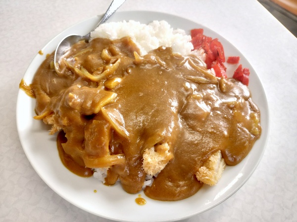 東洋大学川越キャンパスのすぐ近くに、昭和にタイムスリップしたような小さく素朴な食堂を見つけた。いったいいつから営業しているのか、時代に取り残されたかのようにポツンとある小さな食堂。中に入るとおばあちゃんが椅子に座って編み物をしていた。とても元気そうだけど、腰も曲がってかなりしんどそうだ。客は大学生が多いようだが、昼前は狙いどき。おばあちゃんひとりで切り盛りしているようなので、他に客がいると待たされることもあるようだ。ここはとにかく値段が安い。おそらく儲けようとは思っていないのかな。つい最近、ちょっとだけ値上げしたけど、それまでカツ丼やカツカレーなどワンコインで食べられたのだ。しかもボリューミー。定食類もいくつかあるけど、どれもリーズナブル。どれも味付けはけっこう濃いめで、素朴で、家庭的な感じ。今回はカツカレーを注文。大盛りにしなくてもこのボリューム。カレーは中辛かな?それなりにスパイシーだけど、わりとマイルド。ガツンとは来ない。ルーはしっかりとタマネギの形が残っているので、ちゃんと手造りっぽい。カツはけっこう大きいけど、厚みは普通。ちょっと肉は硬め。特別美味しいってわけでもないけど、普通に美味しいし、ボリュームもあって、これでこの値段は凄すぎる。何気に通いたくなる、閉店して欲しくない店だ。