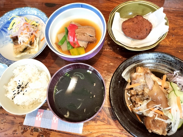 新しくなった牧志公設市場は、いまやすっかり観光客向けの施設になっている感じで、気軽に郷土感を味わうには面白いところだ。その付近で食事できるところを探していて、市場のすぐ裏にある「あかさたな」という食事処がとても気になった。すぐ裏なのに妙に隠れている感じがあって、素朴な感じもいい。メニューを見るとけっこうリーズナブルで美味そうなので入ってみることにした。定食は郷土料理を小鉢でセットにした感じの「おすすめ小鉢御膳」が良さそう。席について料理を注文するが、いくつか種類がありとても悩む。そして番号でオーダーする。驚いたことに周囲の客は自分たち以外すべて外国人だった。店の威勢のいいおばちゃんも、ほかはみんな外国人だよ。と教えてくれた。しかも、そのおばちゃん、英語も堪能で臆することなくガンガン攻めて、しっかりと説明してオーダーをとってくる。凄いなぁと感心してしまった。今回は四番の「テビチの煮こみ、三枚肉と野菜の煮物、どぅる天(小)、グルクンの蒸し焼き、沖縄のイカすみ汁、白飯」を注文。どうでしょう、この素晴らしい取り合わせ。どんどん小鉢がテーブルに並んでいくけど、どれも美味そう。しかも小鉢といいながらも、しっかりとボリュームもあるぞ。テビチはプルンプルンで甘くてとろける感じ。煮物は見た目も上品で味は濃いめだけど、旨味が強くて美味しい。グルクンはさっぱりと蒸されているけど、酸味の効いた味が染みてて美味い。イカすみ汁は意外とあっさりだけど、これまた奥深いコクを感じる。どれも味付けがとても上手。日本人も外国人もすっかり虜にしてしまう感じだ。こんないい場所なのに穴場的な雰囲気がとても気に入った。