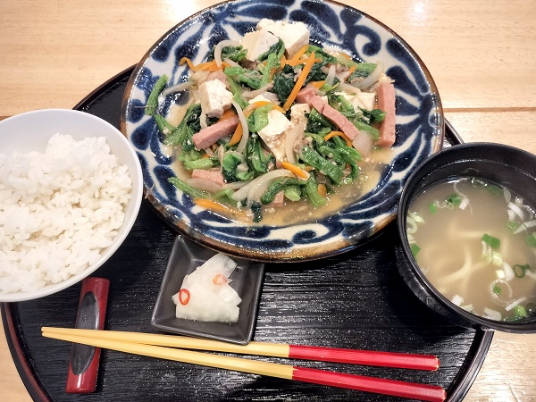 沖縄の朝は遅い。最近、少しずつ朝から営業している店も増えてきたものの、いつも朝はモーニング難民になってしまう。少し遅めの朝食ということで、やってきたのは浮島通り「浮島BASE」という小さなそば屋。なかなか洒落たネーミングだが、小ぢんまりとした素朴な雰囲気。沖縄そばだけでなく、定食類も充実している感じだ。そばも食べたいけど、ごはんも食べたいと欲張った結果、ミニそばの付いたちゃんぷるー定食を注文してみた。ちゃんぷるーも色々と種類があるけど、「カラシナちゃんぷるー」にしてみた。まだ午前中だが、続々とお客さんが入ってきて、すぐさま満席状態になった。あと少し遅かったらアウトだったな。そして出てきたカラシナちゃんぷるー。カラシナ、豆腐、ミート、タマネギ、ニンジンのちゃんぷるーだ。さっそく食べると、うむむ、旨い。何だろう、とっても深みのある甘さが口に広がる。何か特別な出汁でも使っているのか、こってりとまではいかない程度の濃厚な旨味を感じる。カラシナはシャキッとして歯切れは悪いが、さっぱり感があって旨い。これはとても美味しいぞ。ミニそばは、本当に小さなミニそばだった。スープがとても濃厚で、ほんと一口で食べ切れてしまうようなサイズ。旨かったので、物足りなかった。もう少し大きめでもいいと思った。ガッツリといくなら、単品ちゃんぷるーとフルサイズの沖縄そばでもいいのかもね。ただ、どちらも深みのある美味しさで、人気があるのも納得だ。
