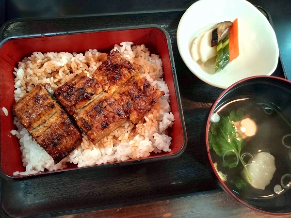 別府駅前の商店街の中、やよい天狗通りと北浜通りの交差点脇にある古びた鰻屋に惹かれた。どうせ観光地価格なんでしょって思って、最初は素通りしたのだけど、再度通りかかった際に外に書かれているメニューを見ると、意外と安い値段でびっくり。老舗を彷彿させるような年季の入り具合といい、「もしや名店?」って感じずにいられない。ということで飛び込んでみた。土曜日の昼前だが、意外と客は少ない。数組がいたが、ほとんど観光客だろうなって感じ。数量限定という「うな重定食」を注文してみた。「本日は鹿児島産鰻」と書かれていた。しばらくして出てくると、定食といっても、うな重の他にお新香とお吸い物がついてくるだけだった。お吸い物は肝吸いではなく、具は麩だった。うな重は、薄めのごはんに3切れの蒲焼が斜めに並んでいる。ボリュームはかなり控えめだが、値段を考えたら、まぁそんなとこだろう。さっそく食べてみると、けっこうフワッと軽く軟らかい。タレもしっかりといい味になっている。まさに鰻屋のうな重って感じ。しっかりと下ごしらえもしてある感じもあり、悪くはない。ただ、やはりボリュームに欠けるので、上うな重ぐらいにしておけば良かったかなとも思った。帰り際、レジではしっかりと消費税が上乗せされていた。そうか、表示は税抜き価格か。でも、けっして高いって感じでもなかったので、悪くはないと思う。