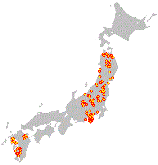 関西方面がありませんが、ほぼ全国的に散らばっていますな