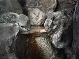 嬉野温泉は佐賀県を代表する大温泉地のひとつで、多くの旅館やホテルが立ち並ぶ、活気ある温泉地です。温泉の歴史も古く、奈良時代の文献にも登場するなど、かなり古い時代から利用されてきているようです。今回は旅の途中、嬉泉館に立ち寄り入浴で訪れました。この宿は小ぢんまりとした旅館ですが、「九州八十八湯めぐり」のひとつに選ばれているなど、ホンモノの温泉と認められた実力派の温泉宿です。今回も楽しみにやってきました。この宿は規模も小さく、また宿泊状況によっては立ち寄り入浴が出来ない場合もあるので、事前に電話連絡するようにホームページ書かれていたので、事前に予約をしてやってきました。辿り着くと、何やら館内は賑やかです。どうやら法事か何かあるようで会席が行われているようでした。入浴の受付をしてさっそく浴場に向かいます。浴場は館内を奥に進んで、階段を降りたところにありました。脱衣所はわりと簡素という素朴な雰囲気があり、こちらも小ぢんまりとした印象です。浴室に入るとこちらはわりとゆったりとした印象があります。手前と奥とふたつの岩風呂があり、岩の上には大きな信楽焼のたぬきが立っていました。石垣風の壁に岩風呂の内湯のみの素朴な浴場ですが、なんとこれらはかけ流しで温泉が楽しめるようです。お湯はトロトロと注がれ、端から溢れ出て流れていました。さっそくかぶり湯をしますが、けっこう熱めです。注がれている湯がそれなりに熱い湯のようです。源泉温度は83度もあるようなので、少しずつ投入して、かけ流しを行っているようです。湯舟は手前側が少し大きく、奥側は小さめの湯舟です。同じように注がれていますが、奥側の方が小さい分だけ冷めにくいのか、さらに温度が高めのように感じました。それでも、浸かっていられないような温度ではないので、じっくりと浸かってみます。しばらく浸かっていると、ジワジワと汗がにじみ出てきます。そして何よりもツルツルスルスルとした、嬉野温泉特有のなめらなか浴感がとても気持ちいいです。肌の表面だけがヌルっとするぐらい、しっかりとツルツル感が味わえるのが特徴的です。浴室は内湯だけなので水風呂などが欲しくなりますが、しばらく浸かったら上がって休憩し、汗がひいてきたらじっくりと浸かることを繰り返して楽しみました。でも、すごく温まりのいい湯のようで、なかなか汗はひかないのも特徴的です。街中にある旅館なので、景色などは眺められませんが、奥側は石灯籠のある小さな坪庭になっていて、風情ある佇まいを演出しています。そのためか、内湯のみなのに、妙に居心地のいい浴室に感じました。しばらく浸かったところであがりますが、浴後もいつまでもポカポカと体を熱く感じるほど、よく温まりました。また、肌もツルツルと滑らかになり、さすがは嬉野温泉だと、心まで嬉しくなるホンモノの温泉でした。