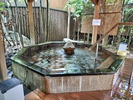 山梨県南部、富士川へとつながる下部川沿いにある下部温泉にやってきました。下部温泉郷に来るのはとても久しぶりです。静かな山あいですが、いくつもの温泉旅館が建ち並び、とても賑わいを感じる温泉地です。温泉としての歴史も古く、平安時代の承和3年(836)に温泉が湧いたとの伝説もあるとのことで、鎌倉時代や室町時代の文献からも記載がみられることから、長く愛され続けている温泉地のようです。近くには身延山久遠寺があることから、参拝客が訪れるなど江戸時代には湯治場としても賑わっていたそうです。今回はその玄関口にある下部ホテルに立ち寄りで入浴してきました。ここはとても大きく優雅なホテルで、前々からずっと気になっていたところです。宿泊で利用したかったのですが、今回は日帰り入浴となりました。フロントで受付をしてさっそく浴場に向かいます。浴場は男女入れ替え制のようで、今回は「松ぼっくりの湯」というのが男湯となっていました。脱衣所はゆったりと広く、大きめの棚にカゴがずらりと並びます。手前側には貴重品用のロッカーも用意されていました。洗面台も広くて清潔感があり、さすが優雅な旅館の浴場という感じです。浴室もまた広くてとても明るくゆったりとしていました。手前側に洗い場が並び、正面には横に広がった大きな湯舟があります。洗い場にはボディソープ、シャンプー、コンディショナーが用意されていますが、それとは別に色々な種類のシャンプーが用意されていて、好みに合ったものを利用できるというサービスがありました。女性にはウケが良さそうです。さっそく体を流して湯舟に浸かりますが、湯舟は左側が大きく、右側が少し小さめです。見た目にはどちらも無色透明の湯が入っているので同じに見えますが、実は泉質が異なるようです。下部温泉にはいくつか異なる泉質の源泉があることでも知られていて、このホテルでは三種類の源泉を使い分けているとのことでした。大きい方は「下部温泉共同泉」と書かれています。泉質はアルカリ性単純温泉で、癖のないとても滑らかな感触があるようです。ちょっとぬるめの湯となっていて、夏場だったのでとても気持ちよく利用することができました。小さい方は「下部ホテル硫黄泉」と書かれています。どうやら自家源泉のようです。泉質はアルカリ性単純硫黄泉ということですが、特に目立った特徴はありません。むしろ滑らかなで大人しい印象の湯です。そしてけっこうぬるい湯となっていました。体温ぐらいかなぁという温度帯です。白い湯ノ花が舞うこともあるようですが、見たところまったく見当たりませんでした。また、匂いも特に気になる感じのものもなく、あまり硫黄泉っぽくは感じない湯でした。外側には露天風呂があります。こちらもゆったりとした大きな露天風呂で、手前側に「八角檜風呂」という八角堂のような屋根のついた木造湯舟がありました。こちらは「しもべ高温源泉」と書かれています。泉質はアルカリ性単純硫黄温泉と書かれています。こちらも内湯の硫黄泉と同じように、無色透明であまり硫黄泉っぽくは感じませんが、高温源泉と書かれているとおり、少し温度は高めとなっていました。でも、高めといっても普通の温度か、それよりぬるいかなって感じです。「NEW」と書かれていたので、どうやら新しい源泉のようです。露天風呂は奥に大きな岩風呂があります。岩風呂の手前は小さく区切られていて、下部温泉共同泉とありましたが、内湯よりもかなりぬるい湯となっていました。冷たくはないぐらいの温度で、クールダウンにちょうどいい感じ、いや、浸かっていると睡魔に襲われそうな温度です。ただ、不思議なことにこの湯舟だけ、微妙に薬草っぽい匂いがするのです。よくスーパー銭湯などにある漢方薬系の濃厚な薬湯的な匂いです。ほんの微かになのですが、時折漂ってくるのです。妙に不思議に感じました。奥の湯舟はゆったりと広くて、そのわりに森の隠れ湯のような雰囲気もあり、なかなかワイルドながらも落ち着いた雰囲気がありました。こちらも温かいけど少しぬるめなので、じっくりまったりと浸かることができました。それにしても本当に快適で過ごしやすく、雰囲気がとてもいいです。やはり宿泊で訪れたい宿ですね。いつか、泊まってみたい宿となりました。
