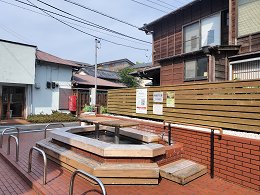 伊豆の西海岸、「なまこ壁」で有名な松崎町の街中に溶け込むようにして「新浜の足湯」という足湯施設があるのを見つけました。松崎海水浴場からもほど近い場所にありますが、商店が点在する静かな住宅街の片隅にポツンとある足湯なので、場所は事前に調べておかないと、少しわかりづらいかもしれません。この足湯ですが、地味な場所にあるにもかかわらず、けっこう立派な施設です。レンガ張りの敷地に木造のベンチで囲まれた、ゆったりとした湯舟があります。しっかりと作られた感じの立派なもので、床は二段になって足湯の付近が少し高くなっています。元々、何かの跡地なのか、何かをイメージしたものなのかはわかりません。けっこう細かな部分もしっかりと作り込まれていて、湯舟の中にはテーブルまで用意されていて、読書をしながらとかじっくりと過ごせそうな雰囲気がありました。それにしても、どういう経緯でこの足湯が作られたとかの説明は一切なく、ただポツンと当たり前のように立派な施設があります。この足湯公園のコンセプトなどの説明の案内板があってもいいのになと感じました。海水浴場も近いためか、脇には足を洗うための水道も用意されていて、至れり尽くせりの施設です。ただ、屋根はないので、夏場の昼間はキツイかもしれません。今回は6月下旬のめちゃくちゃ暑い日の午後、やはり誰も利用者はいません。お湯もけっこう熱めの湯がトロトロと注がれていて、ちょっと浸かっているだけで汗だくになるほどでした。無色透明の湯で、けっこうあっさりとした湯ですので、足湯にはぴったりの泉質です。しっかりと温度があるのでこれだけの温度なら、冬場でもしっかりと温まりそうな感じです。足湯は通り沿いに面してはいるものの、そんなに交通量があるわけでもないので、けっこう静かに利用することができました。とても綺麗に整備されていて、清潔感もあるので、しっかりと管理されているのでしょう。意外と穴場的な雰囲気もあるので、松崎観光のついでに散歩がてら立ち寄ってみるのもいいでしょう。