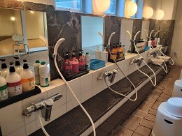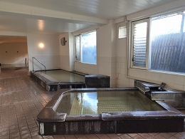 伊豆半島の東側、都心からのアクセスもよく、海の幸、山の幸、そして天然温泉を楽しめる伊東温泉は、伊豆を代表する大きく活気ある温泉地です。古くから文人にも愛され、多くの文豪が逗留しながら執筆活動に励むなど、活気がありながらも静養向けにゆっくりもできる優雅な温泉地です。いつも賑わう伊東温泉、今回は平日に訪れましたが、相変わらず賑やかな印象があります。そして訪れたのは「伊東園ホテル本館」です。伊東園ホテルズ発祥のホテルですね。伊東大川沿いに建つ大きなホテルです。浴場は「川蝉の湯」「エンゼル風呂」とあり、男女が時間で入れ替わるそうです。今回は「川蝉の湯」に入りました。エントランス右、フロントの脇を抜けた先にあります。脱衣場に入ると右側に洗面台、左奥に脱衣棚がありました。けっして狭くはないのですが、意外と小ぢんまりとしているなという印象です。浴室は横に細長く、左奥に大きな湯舟、そして正面に洗い場、右に行くと二つ湯舟が並び、突き当りにも洗い場があります。けっこう不思議なレイアウトの浴場です。規模としてはそんなに大きくはないのですが、湯舟が3つもあるので、かなりゆったりとした印象がありました。まずは左側の一番大きな湯舟に浸かってみます。伊東温泉独特のしっとりとした湯で、微妙に黄緑色っぽく色がついているような、いないような、ほぼ無色透明の湯です。ここでじっくりと浸かったあとに、反対側の湯舟へと向かいました。こちらは小さな湯舟と、さらに小さな湯舟が並んでいます。奥に一番小さな湯舟は元々はバブルバスだったのでしょう、湯舟の底にステンレス製の枠がありましたが、ブクブクと気泡が出ているわけでもなく、普通の湯舟となっていました。温度が若干違うようで、一番小さな湯舟が少しぬるく感じました。源泉かけ流しの湯が自慢のようで、トロトロと流れる湯を味見してみました。すると、マイルドながらもショッパイ塩分を感じ、そして後からジワッと苦味を感じる湯です。泉質はナトリウム・カルシウム-塩化物温泉です。浴室は脇に大きなガラス窓があるのですが、曇りガラスになっているので、景色などは見えませんがとても明るく感じました。湯舟に浸かっていると、奥の隅に「露天風呂」の文字が見えました。どうやらさらに奥があるようです。その扉を開けるとすぐに細い階段がありました。階段を上がると、けっこう大きめの優雅な岩風呂がありました。大きな屋根のついた岩風呂で、なかなか風情を感じる佇まいです。さっそく入りますが、熱すぎずぬるすぎずの適温です。また、外気に触れている分だけ酸化が進んでいるのか、内湯よりも色鮮やかに感じます。ちょっとライムグリーンのようにも見えました。しかしながらけっこうな量の湯が注がれているようで、湯舟の端からは相当量の湯が溢れ出て流れていました。さらに奥にはサウナもありますが、このときは使用できなくなっていました。それにしてもなかなか雰囲気のいい露天風呂です。ただ、街中にあり、交通量の多い通り沿いということもあって、とてもうるさく賑やかな喧騒がありました。まぁ、これは仕方がないですね。でも、そんな喧騒でさえも優雅に感じる露天風呂が気に入りました。湯量豊富でさすが伊東温泉、日本トップクラスの湯の街だと感じました。