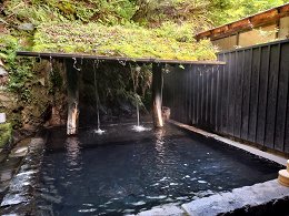 筋湯温泉は大分県玖珠郡九重町にある素朴な温泉地です。静かな雰囲気の温泉地ですが、いくつもの温泉宿が立ち並び、静養向けの人気の温泉地となっています。温泉の歴史も古く、平安時代の天徳2年(958)に開湯し、温泉地として整備されたのは江戸時代からとのことでした。筋湯温泉には気軽に利用できる外湯がいくつかあり、今回はそのうちのひとつ「露天岩ん湯」に入りました。ここはいつもタイミングが合わなくて、今まで入れなかった温泉のひとつです。というのも、偶数日と奇数日で男女が入れ替わるシステムで、訪れるタイミングでいつも女湯になってしまっているのでした。もっと昔は混浴だったのですが、日替わりで男女交替するようになったので、日程を調整してからでないと狙うのは大変です。そして今回、それこそ何回目だろう?ってほど、ようやく念願かなっての入浴です。7月上旬の日曜日の午前中に訪れましたが、とてもひっそりとしています。ごちゃごちゃとした旅館街の一角、隅の方に隠れるようにして建っていました。入口の「本日は男性専用です」の表示を確認して、さっそく中に入ります。黒塗りの小ぢんまりとした小屋ですが、小屋の部分は手前の脱衣場だけで、そのすぐ正面には露天風呂があります。とても小さな施設で、数人の利用があったらいっぱいという感じです。常駐の管理人はなく、扉を入ったところに料金箱があるので、各自で料金を支払います。小銭が無い場合は、うたせ大浴場の自動販売機でコインを購入し、それを投入してもいいそうです。脱衣場はほんと簡素なもので、脇に棚があるだけです。コインロッカーなどはありませんが、湯舟が目の前なので心配はないでしょう。湯舟は石造りになっていて、正面には2筋の打たせ湯があります。打たせ湯の背後には山の斜面があり、大きな岩がせり出していました。岩ん湯の名前の由来はこの岩ですかね。手前側に桶が用意されていますが、洗い場のようなスペースはありません。かぶり湯をして、湯舟に浸かるだけです。石鹸類の使用も禁止されているようでした。かけ流しの湯はそのまま排水されているようなので、仕方がないですね。湯は無色透明で、けっこう熱めの湯です。底がヌルヌルっとして滑るので要注意です。お湯はサラサラとした湯なのですが、苔のようなものが生えているようです。しっかりと清掃はされているようですが、泉質によっては特に露天風呂だと苔が発生しやすくなるのでこれも仕方がないですね。打たせ湯はなかなかの湯量で、ドバドバと流れ落ちています。湯舟の湯が熱いので、こちらも熱いのかと思いきや、こちらはそうでも無かったです。ならば、どこから熱い湯が注がれているのかと不思議に思いましたが、打たせ湯のすぐ脇からも湯が注がれていて、そちらがかなりの高温でした。それにしてもずいぶんとワイルドな雰囲気です。打たせ湯の屋根は苔むしているし、背後は藪のようになった崖だし、野趣たっぷりです。自然の中にあるので、季節によっては虫が多いは難点ですが、パンチの効いた打たせ湯を浴びながら、のんびりと過ごすのは、マイナスイオンがいっぱい感じられる気がして、とても癒されます。しばらく利用していましたが、結局終始貸切状態で、誰も利用者がいませんでした。タイミングも良かったのかもしれませんが、穴場的な雰囲気もすごく良かったです。2日に一度しか入浴のチャンスはないのですが、是非ともチャレンジして欲しい温泉です。