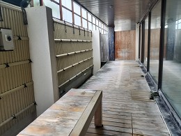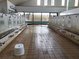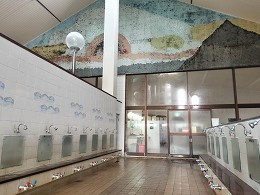 青森県東部にある三沢空港は米軍と自衛隊、そして民間空港と、3つの組織が共同で利用するという、とても珍しい空港です。三沢はとてもローカルな都市ながらも、アメリカ兵も多く駐在するということで、市内のいたるところに英語表記が見られるのも特徴のひとつです。また、三沢は地味に温泉施設が多いのも特徴です。あまり温泉街の印象はないものの、あちらこちらに素朴な温泉施設が点在しています。三沢空港の近く、住宅街の一角に木崎野温泉という温泉銭湯があります。空港からもクルマで数分のところにあり、とても便利な場所にあります。地図を見ると県道沿いにあるように見えますが、住宅街側からのアクセスとなるようです。けっこう大きめの温泉銭湯ですが、少し年季も入ってきていて、ローカルさも感じる佇まいです。館内に入ると、まずは下足箱、そして入浴券の自動券売機があります。入浴券は今や珍しくなってきてしまった、レトロなプラスチック製の札となっていました。すぐに番台があり、右側が男湯、左側が女湯となっています。番台の正面にはゆったりとしたロビーもあり、広々とした印象がありました。脱衣所もまたゆったりと広いです。棚にカゴが並び、一部にコインロッカーもありました。洗面台には10円玉利用のドライヤーも設置されています。とてもシンプルな銭湯という感じです。浴室に入ると足元がビシャビシャです。というのも、出入口のところにチョロチョロと水が流れています。これ、設置してある施設って意外と少ないですが、とてもいいシステムだと思います。とても心配りができている感じがあり、好印象です。浴室もまたシンプルですがとてもゆったりと広いです。洗い場のシマが3列あり、固定式シャワーと湯水のカランがあります。石鹸類は用意されていません。手前側に腰掛と洗面器が山になって積まれているのが、印象的でした。さっそく体を流しますが、シャワーの湯を浴びると、ツルッとした滑らかな感覚があります。もしかしてカランの湯水も温泉水なのでしょうか、それだけ湯量が豊富ってことなのでしょう。湯舟は浴室の一番奥にありますが、それなりに大きいものでした。また、豪快に湯が溢れ出て、床を流れています。かなりの量の湯が掛け流されているようです。泉質はアルカリ性単純温泉で、pHも9.18もあるアルカリ性ということもあるでしょう、床がとてもヌルヌルと滑りやすくなっているので注意が必要です。ほぼ無色透明の湯で、湯舟に浸かるとやはりヌルヌルツルツルと滑らかな浴感が全身を包み込みます。ちょっと熱めの湯ですが、この滑らかな浴感はずっと浸かっていたくなるくらい、心地の良いものでした。湯舟の脇には打たせ湯がふたつありました。けっこう高い位置からドバドバと大量に湯が落ちているので、パンチもなかなか強力です。背中や首まわりに当てると、誰かに肩たたきされているようで、気持ちが良かったです。打たせ湯の脇には外へと出る扉がありました。露天風呂でもあるのかと外へと出てみると、浴室前に板張りの細長い空間があるだけです。涼み処となっているようで、湯舟はありませんがベンチも置かれていて、まったりと過ごすことができます。整ってきたところで、また浴室に向かいます。浴室の隅にはサウナと水風呂もありました。とても料金が安いのに、立派なサウナまであるなんて、なかなかコストパフォーマンスに優れた施設ですね。それにしても、ゆったりと広いので、内湯に居ながらも開放感を感じます。天井も高く、壁には夕陽の景色でしょうか、大きなタイル画がありました。どこをイメージした壁画なのでしょうかね。ちょっとした癒しになっていました。ここは早朝から夜まで長い時間営業している温泉銭湯です。昼間でもそれなりに入浴客が訪れていたので、人気もあるのでしょう。料金も安くて、泉質も良くて、居心地も良いということで、地域の方々に愛されている施設なんだなと感じました。